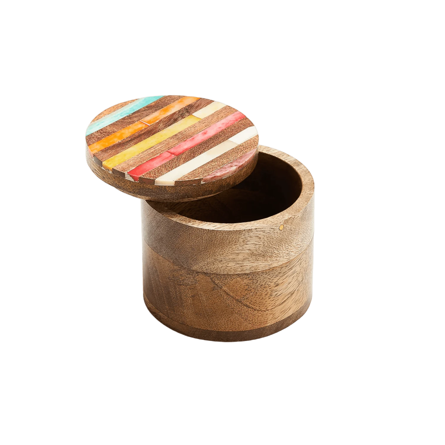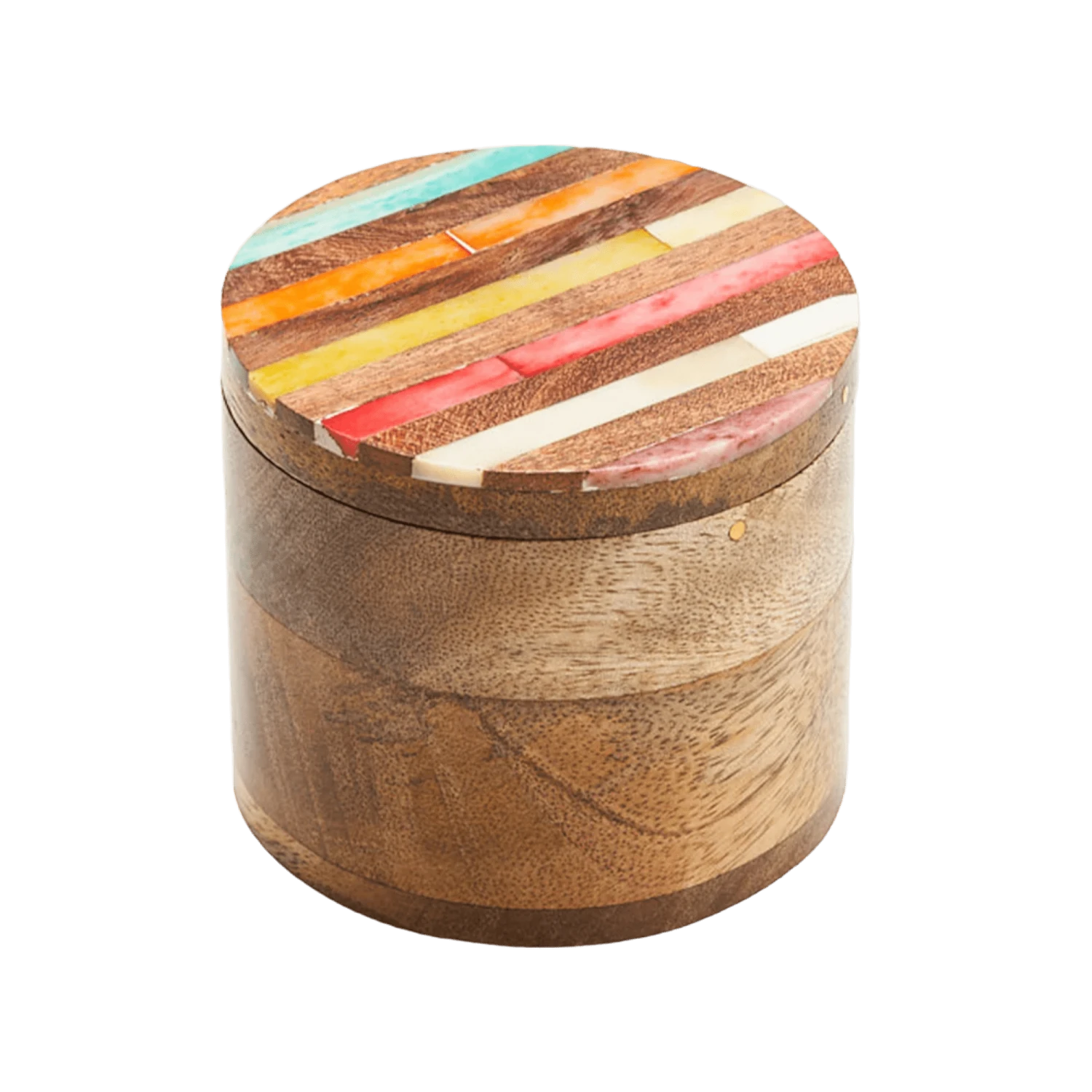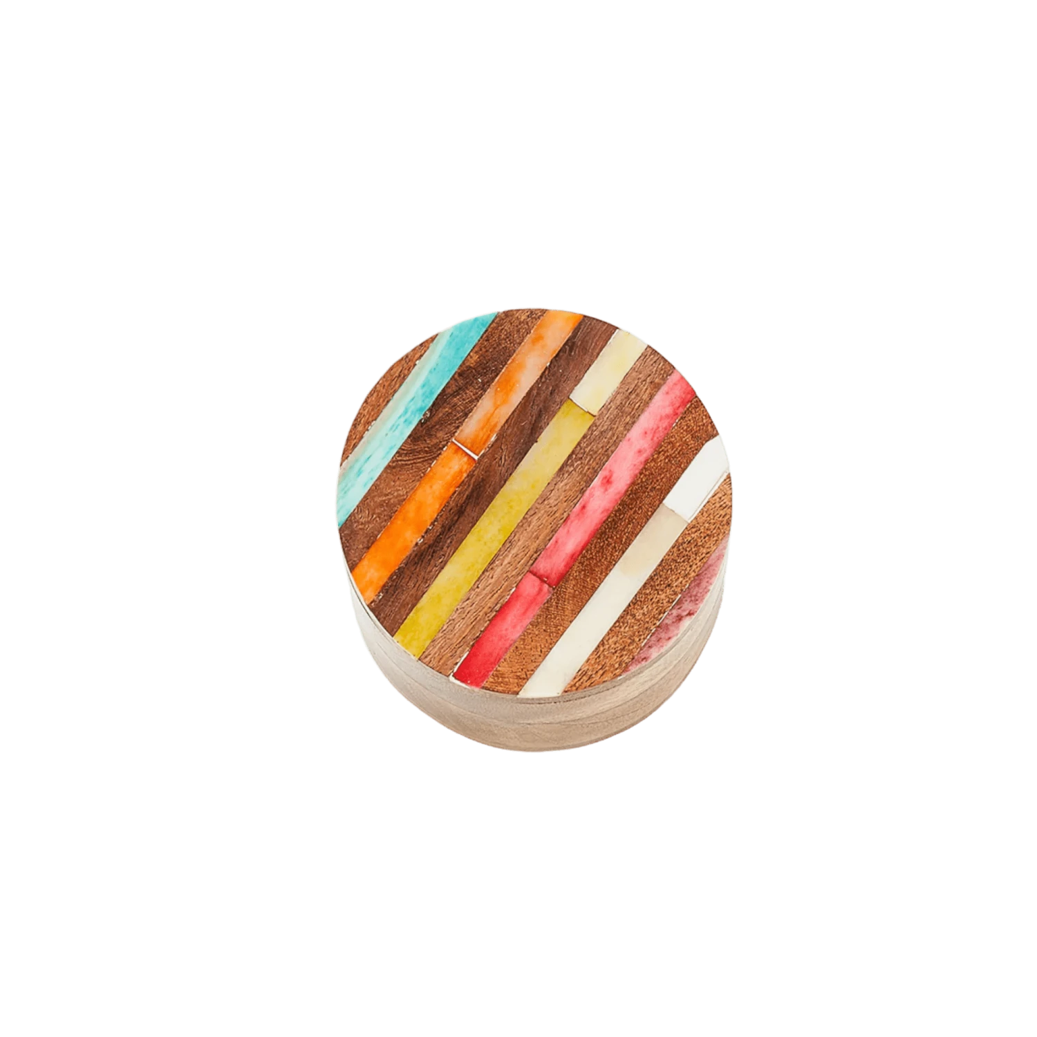 Store and display your trinkets in the Amay Multicolor Round Keepsake Box. Boasting traditional Indian art forms and ethically sourced bone and sustainably harvested mango wood, this handcrafted piece adds a classic charm to any room. The lid displays a unique diagonal ray inlay adorned with colorful, hand-painted accents, while the interior provides a cylindrical opening for safe storage.