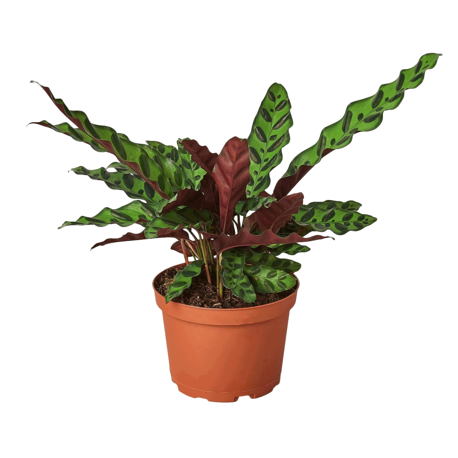 This Calathea Lancifolia also commonly called the Rattlesnake comes with dark green leaves that have unique ripples. Like all Calathea plants, the leaves adjust as the sun rotates throughout the day. Calathea Plants, native to tropical South and Central America, Africa, and the West Indies, are grown primarily for their beautiful, brightly colored, upright, oval leaves.