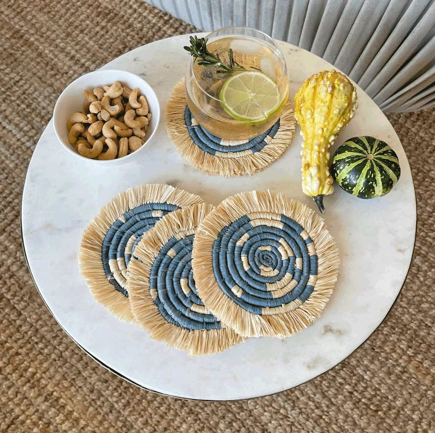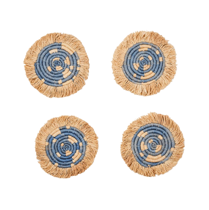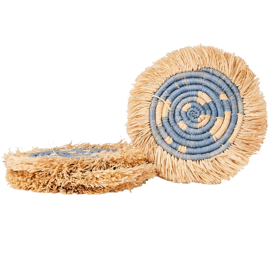 Intricately crafted with timeless tradition, this carefully dyed sisal fiber and sweet grass fringe coaster set makes a bold and exciting statement piece.