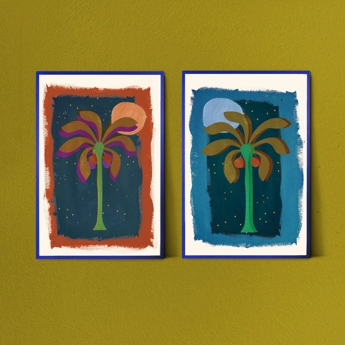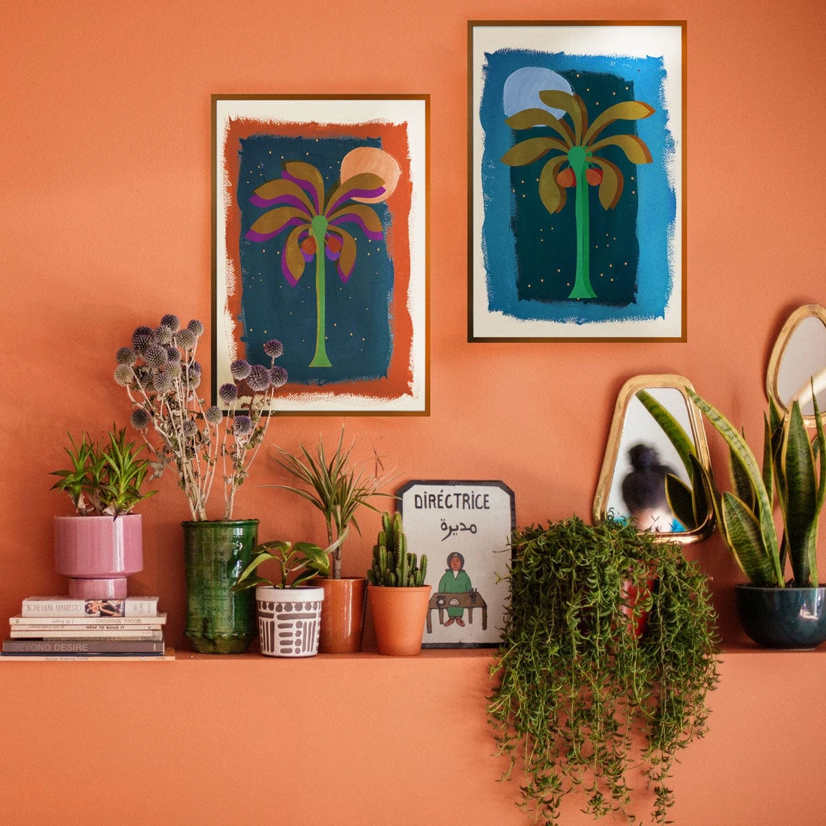 Date Night Moon Art Print by Jungalow® celebrates the beauty and magic of the date palm. In dry desert climates, these glorious trees still grow and flourish and provide nature’s perfect sweetness in their fruit.