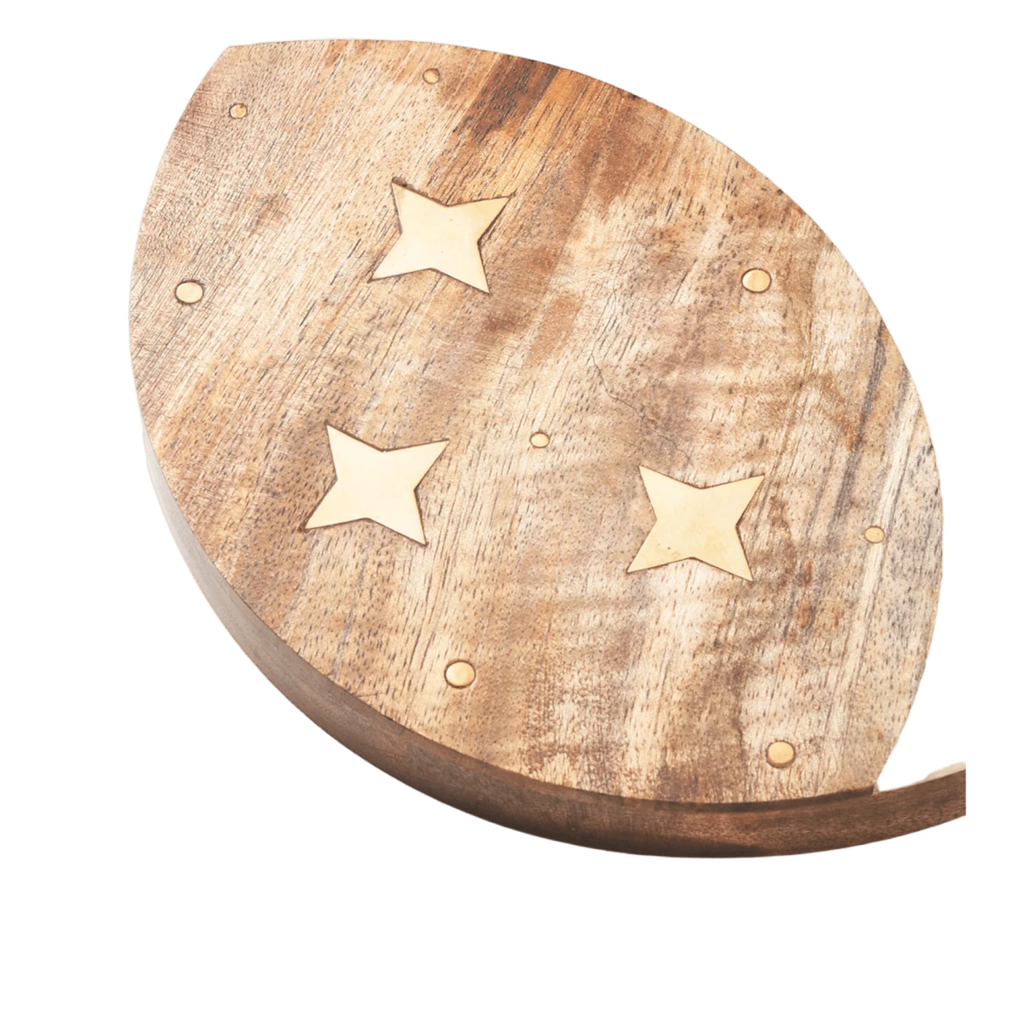 Introducing the Edhit Moon & Stars Cheese Board: expertly crafted from sustainably harvested mango wood in India, this round board features a moon hand carved from ethically sourced bone, and stars handcrafted from gold finish brass, creating a beautiful constellation design. Perfect for entertaining, it is a unique example of traditional Indian wood craft, passed on through generations.