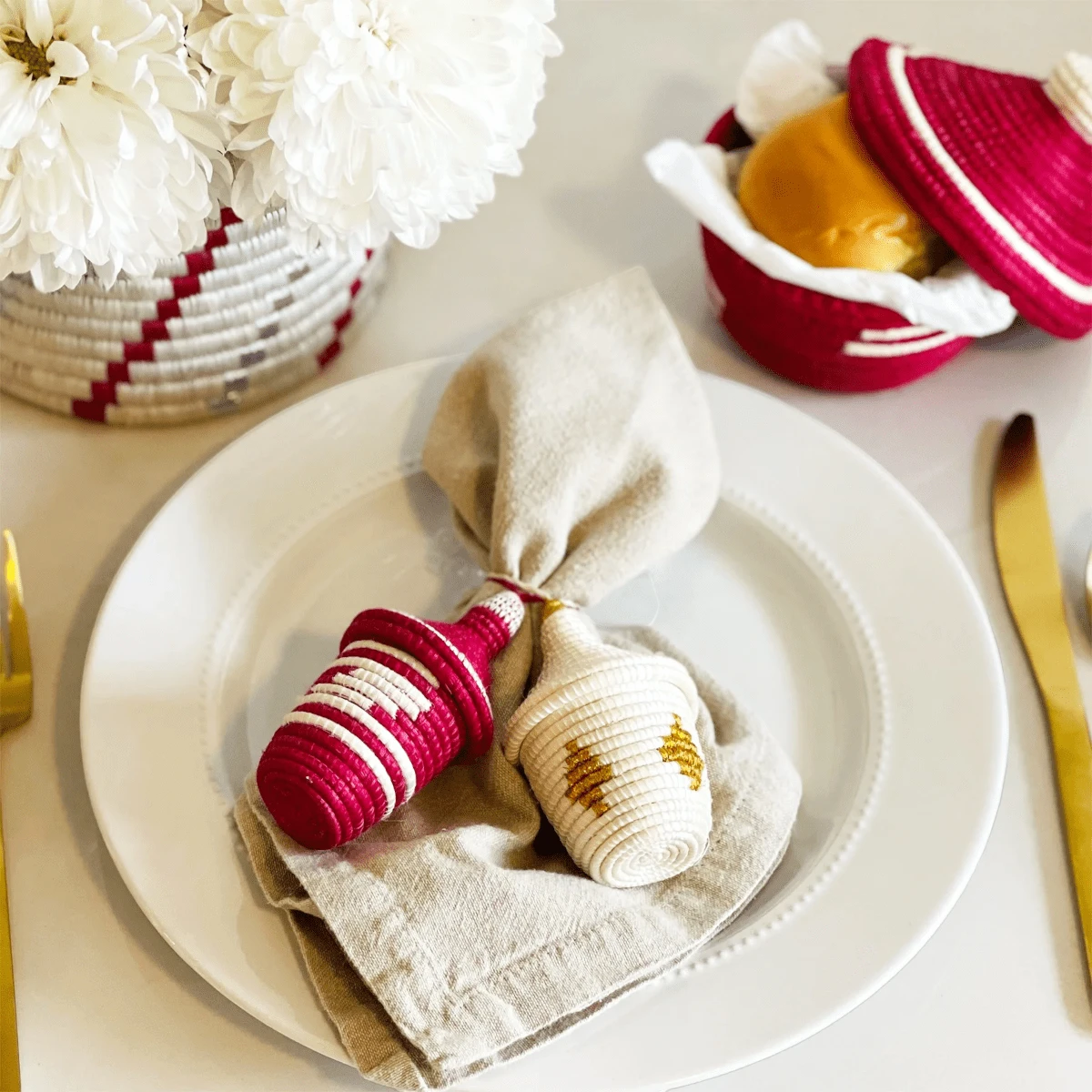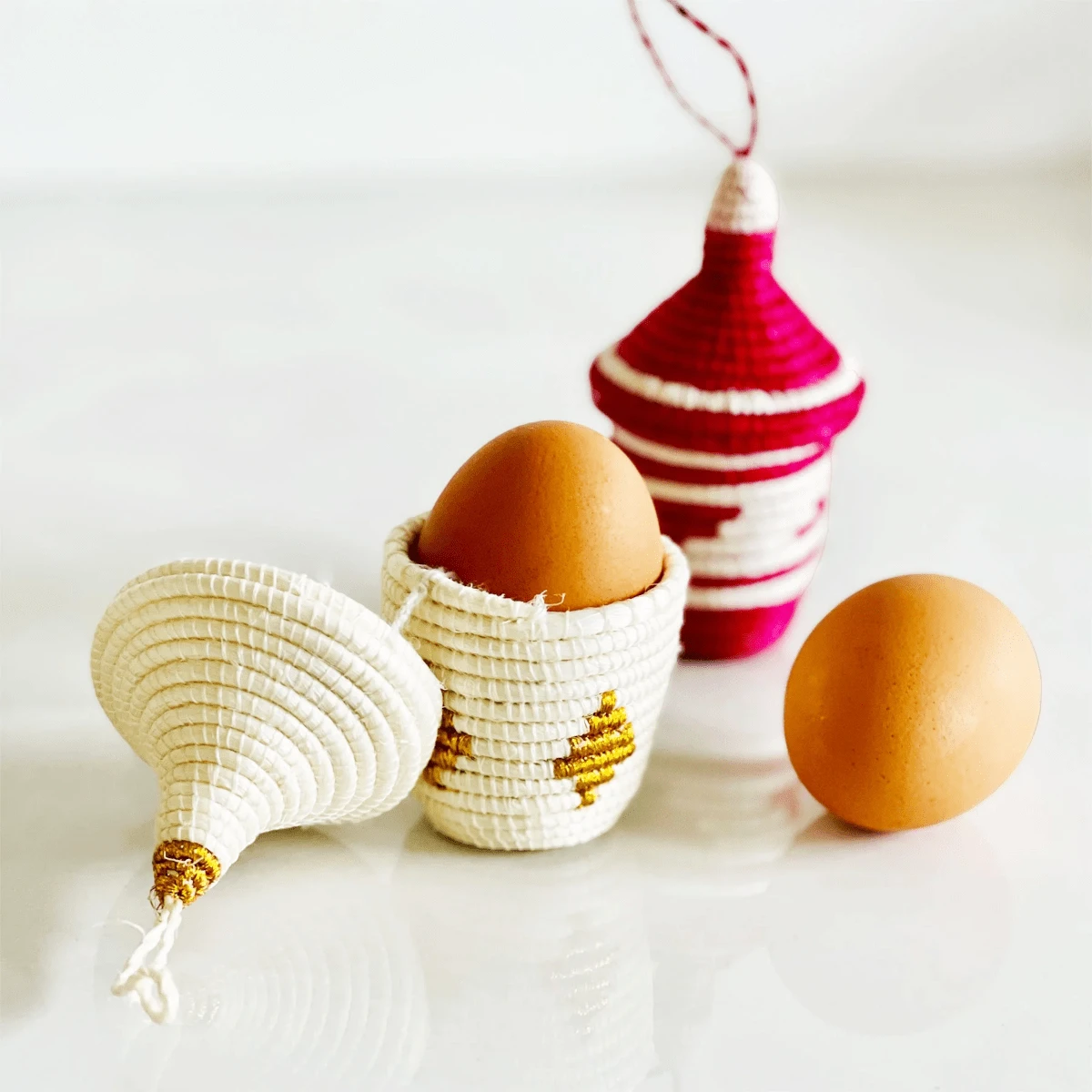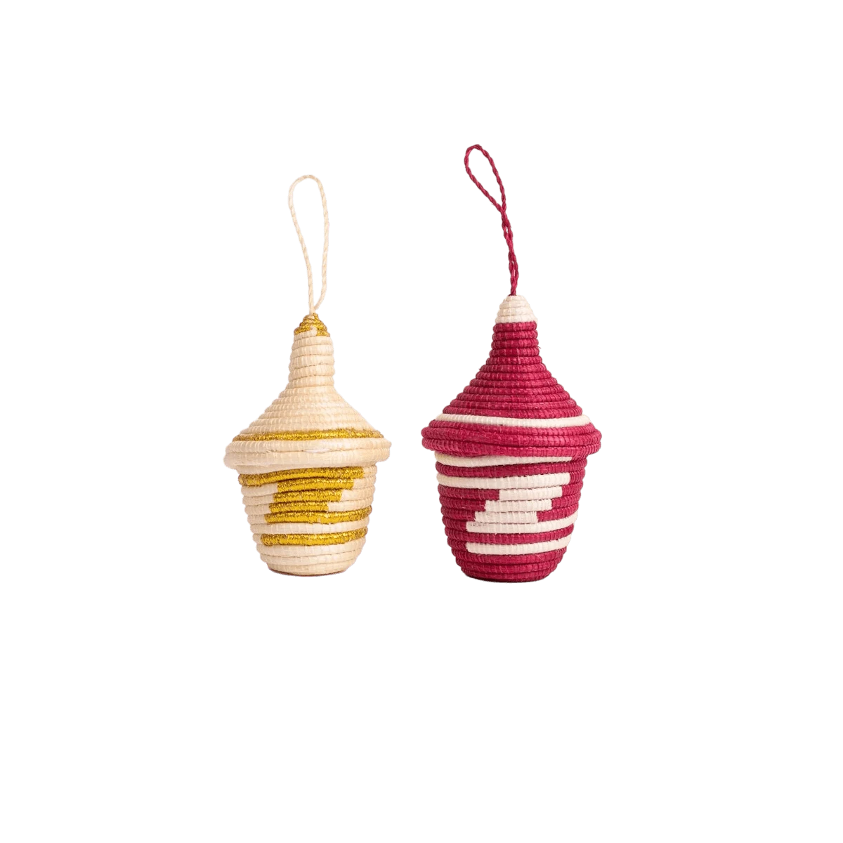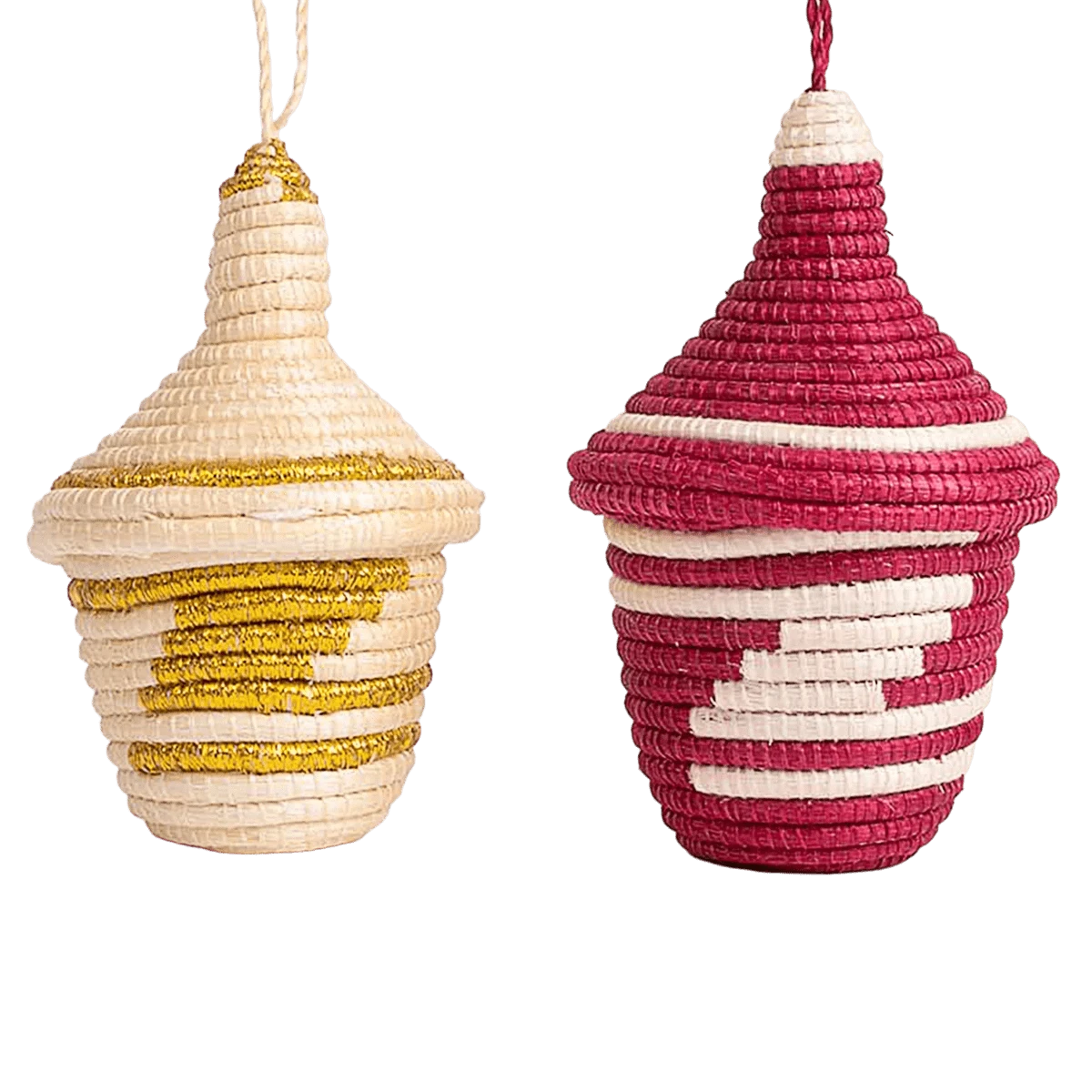 Lift the spirits of any celebration with our handwoven Garnet & Gold Lidded Basket Duo Ornament Set, handmade in Rwanda. Thoughtful, versatile and captivating, they add a spark of whimsy to your tree, gift wrap, table settings, and more. Unique and enchanting, the exquisite craftsmanship of this set makes every moment a special one. Get ready to spread some holiday cheer!