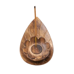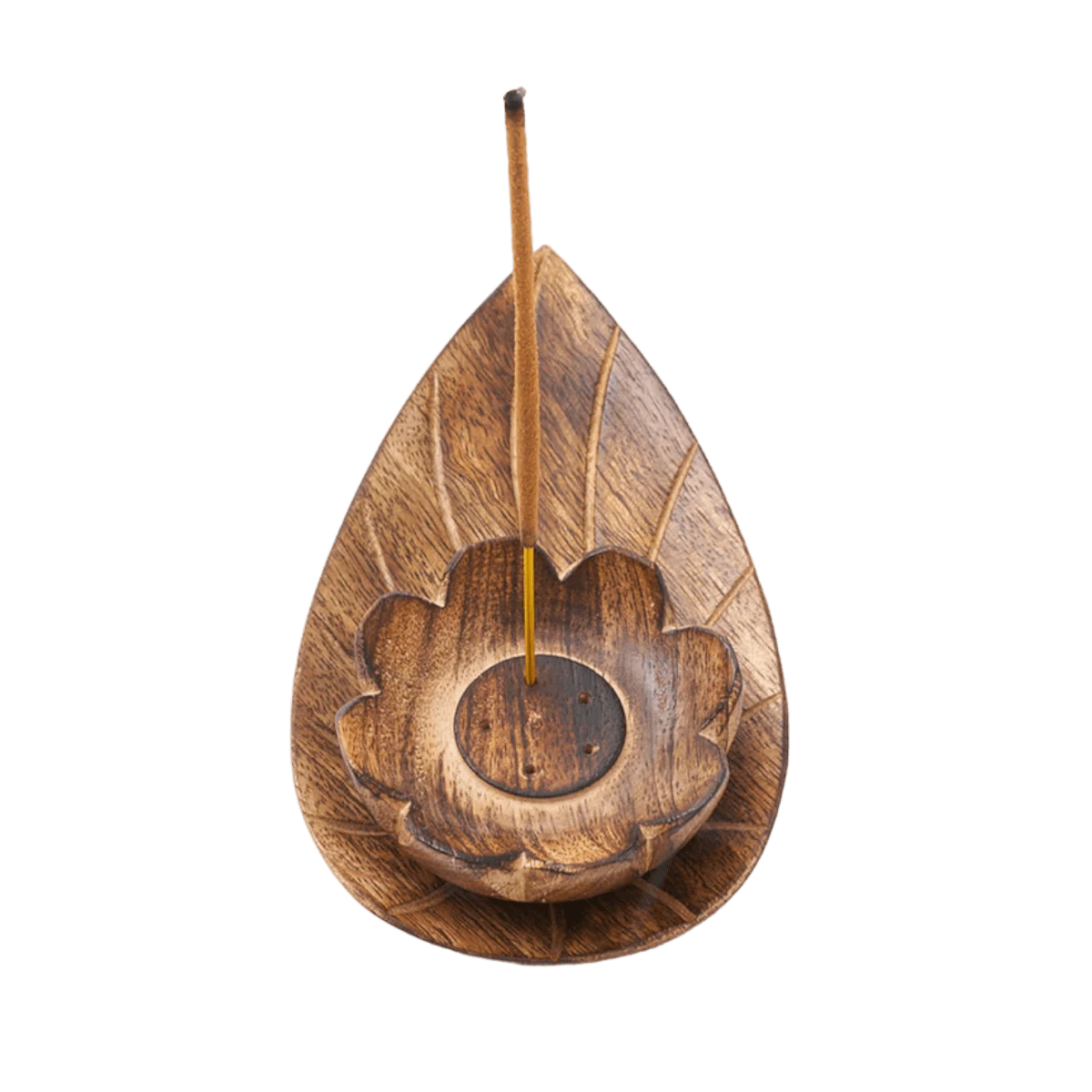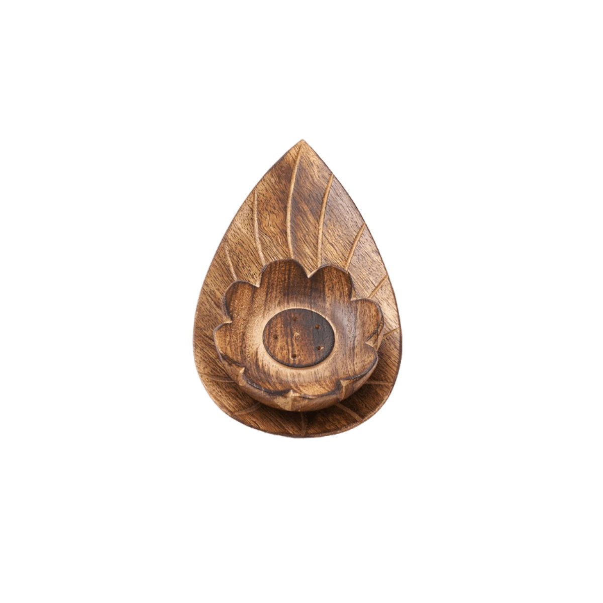 Solid wood incense holder, hand carved in north central India, features a unique lotus design with hand carved detail and five holes to hold incense sticks.
