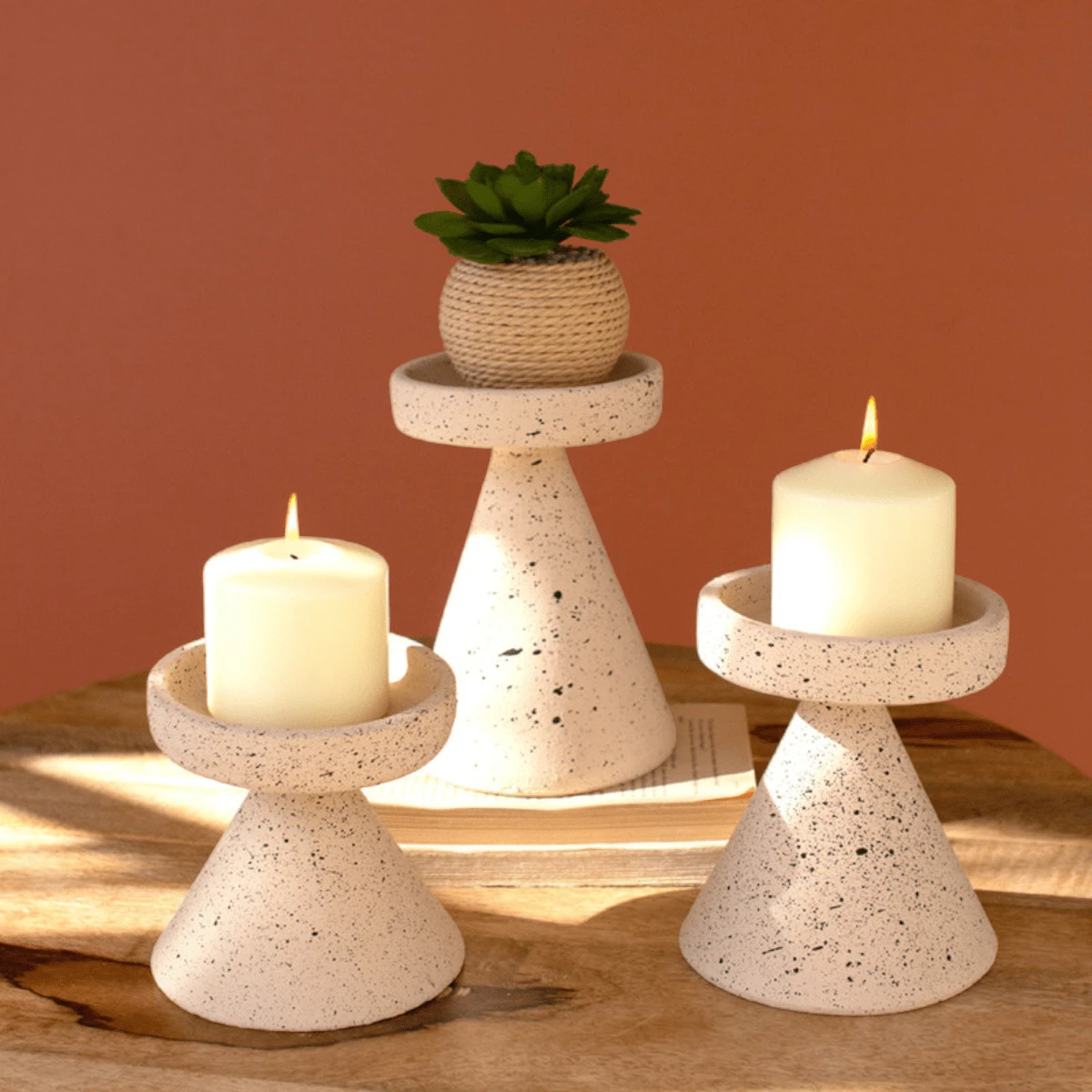 This Satomi Speckled Clay Pillar Candle Holders (Set of 3) adds a unique texture to your home décor. Crafted in Honduras, the conical base and flat sconce gives this set of candle holders a distinct look. The speckled design adds a subtle twist to your neutral colors, making it a great addition to any home.