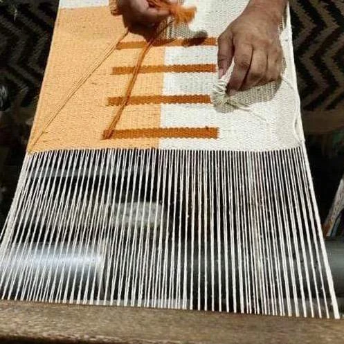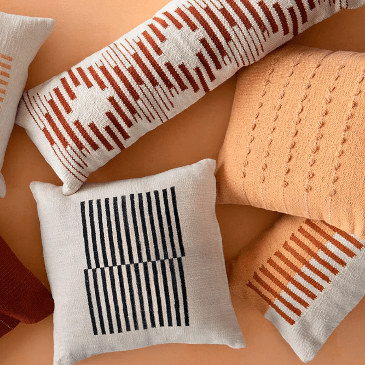 This pillow takes its inspiration from the colors of the sunset. Handmade by master weavers on pit looms, artisans use traditional Indian weaving techniques.
